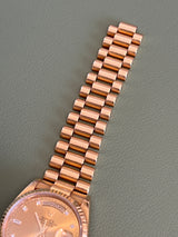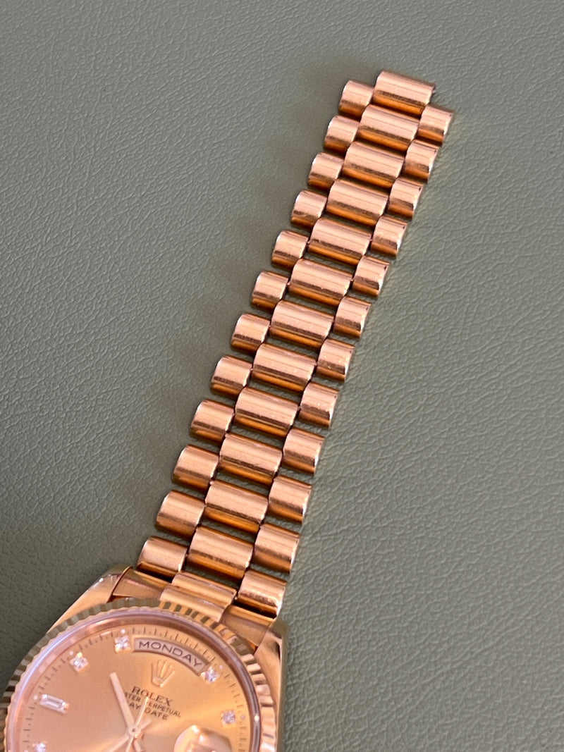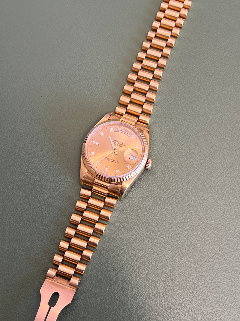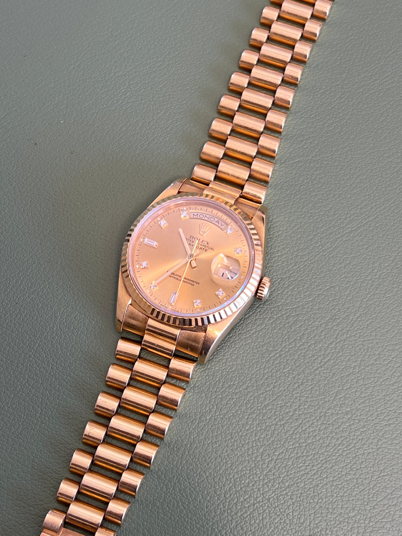 Pre-owned 36mm Yellow Gold 18238 Rolex Day-Date 36 Champagne Diamond Dial with a Yellow Gold fluted Bezel.