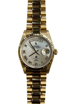 Pre-owned 1989 36mm Yellow Gold Day-Date 36 Double Quick Set 18238 36mm Arabic Day & Date-Wheel Mother of Pearl (MOP) Dial with a Saudi Arabian Royal Family Crest.