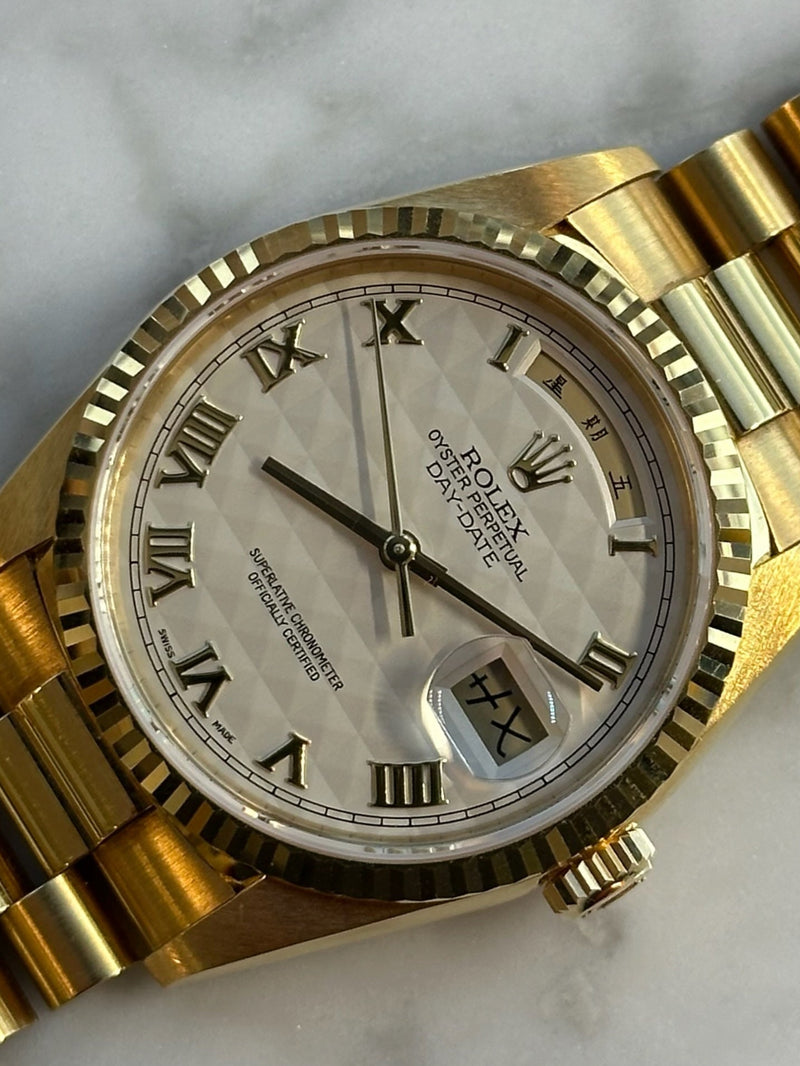 Rolex - Pre-owned Yellow Gold Day-Date 36 Asian Day & Date-Wheel White Pyramid Roman Dial 18238