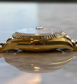 Pre-owned 1991 36mm Yellow Gold Day-Date 36 Asian Day & Date-Wheel White Pyramid Roman Dial 18238 with a Yellow Gold Fluted Bezel.