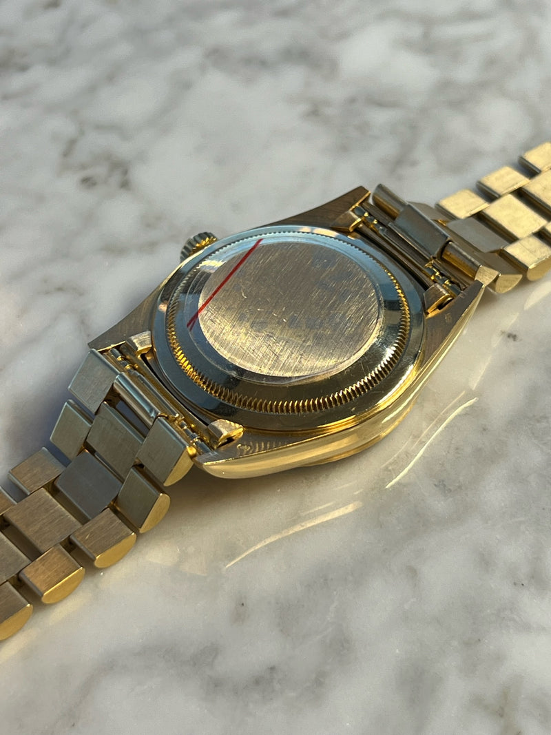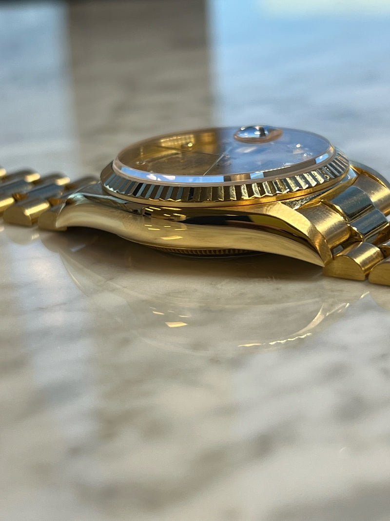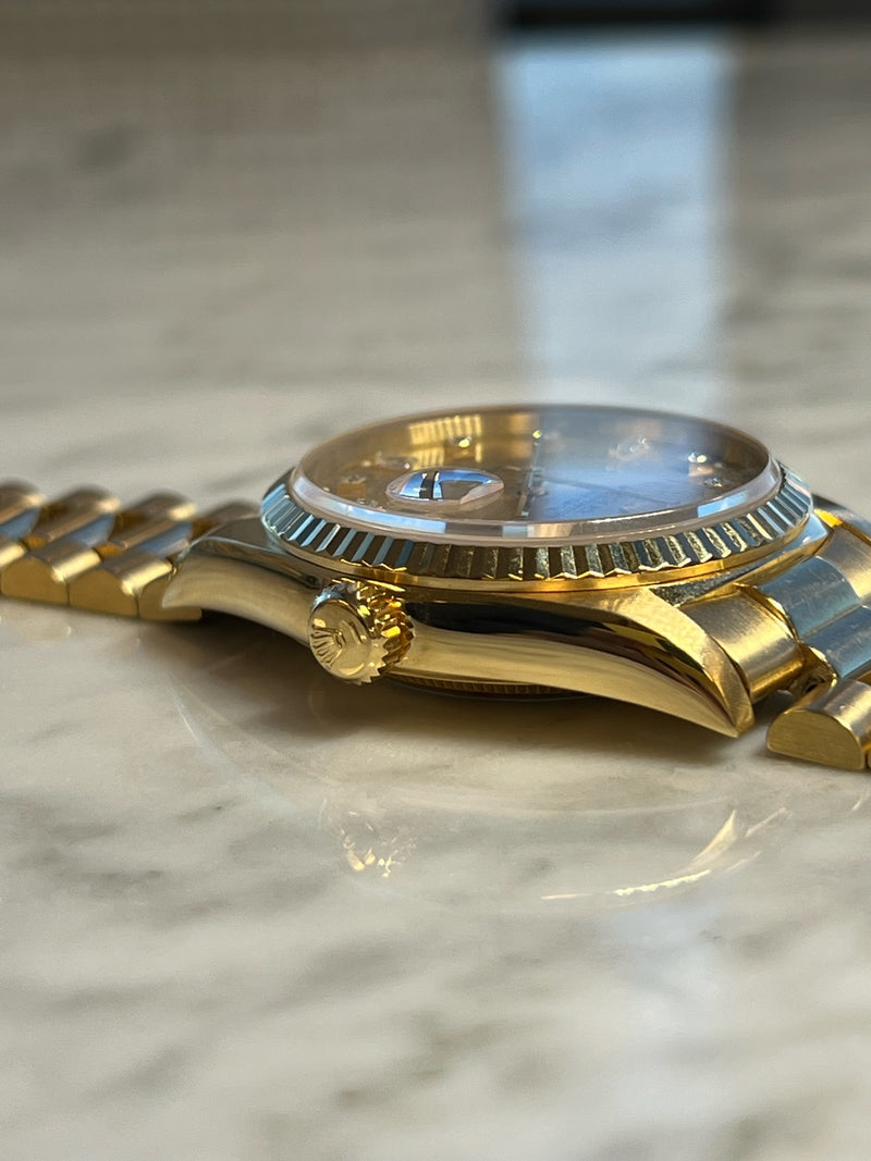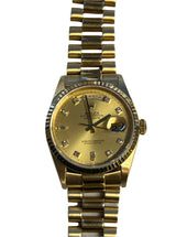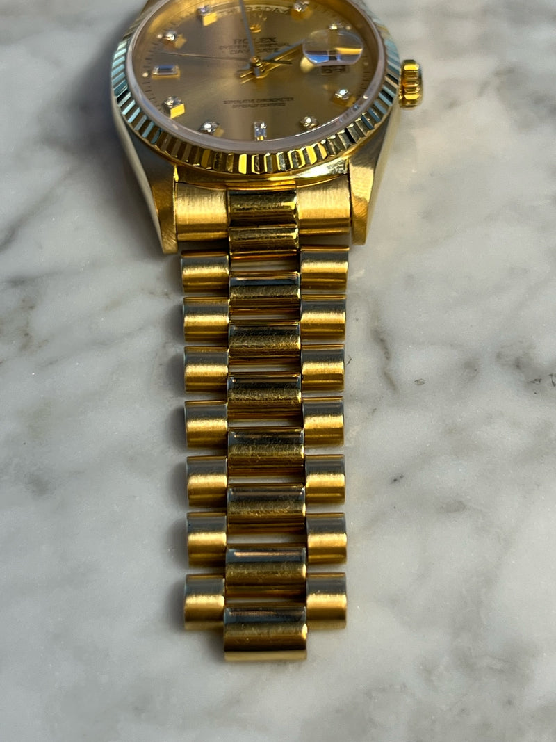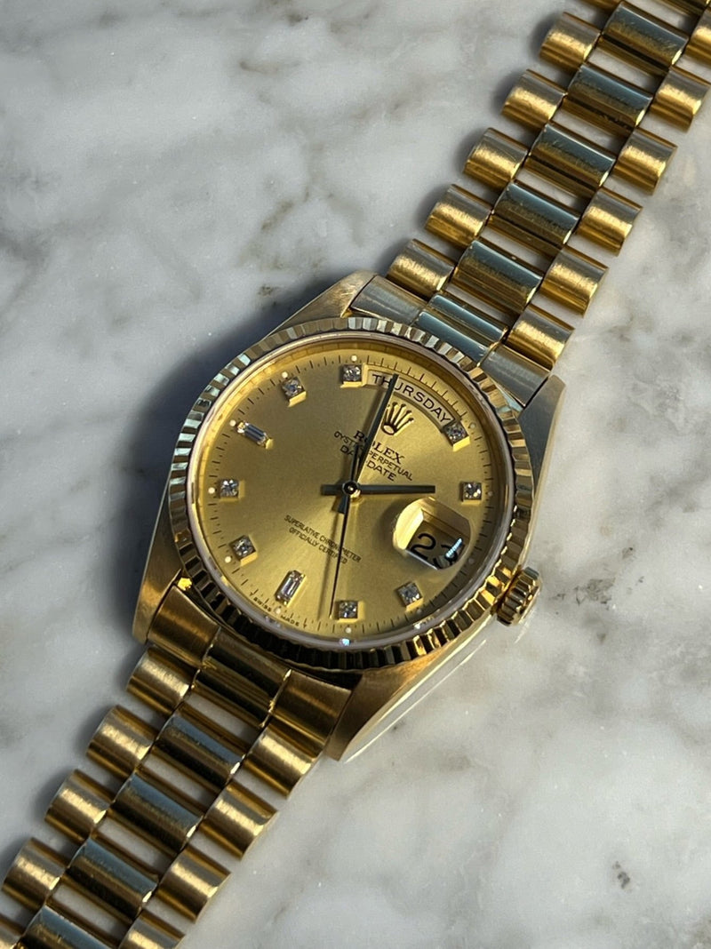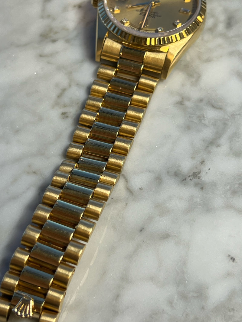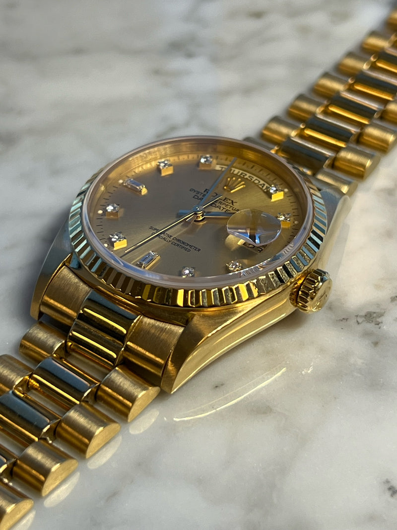 Pre-owned 1995 36mm Yellow Gold 18238 Rolex Day-Date 36 Champagne Diamond Dial with a Yellow Gold Fluted Bezel.