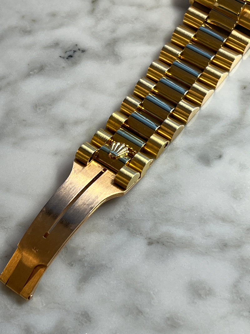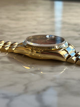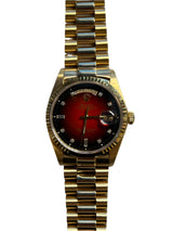 Pre-owned 1981 36mm Yellow Gold Day-Date 36 Single Quick Set German Date-Wheel red vignette diamond Dial 18038 with a Yellow Gold fluted Bezel.