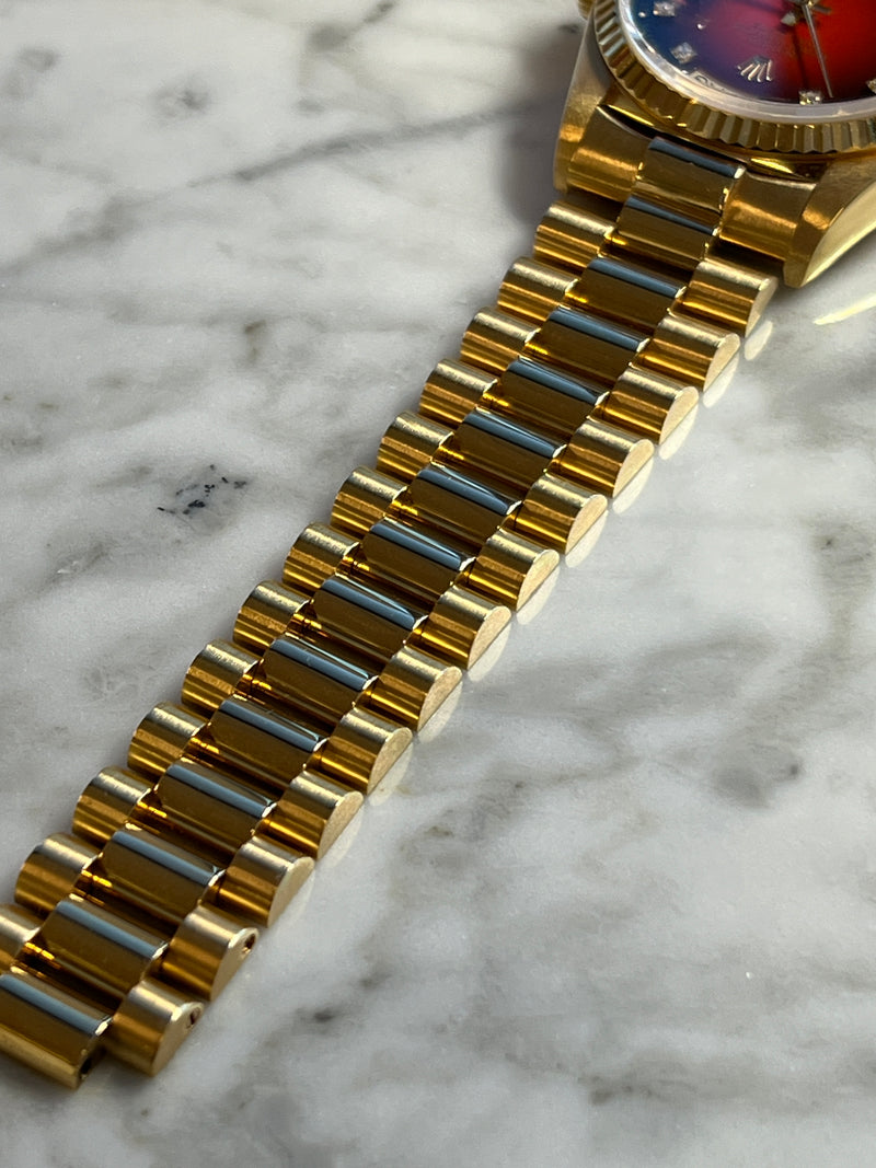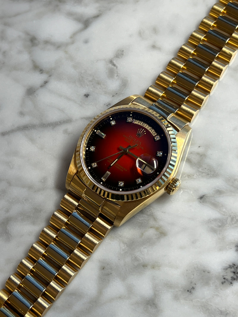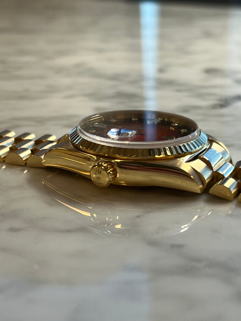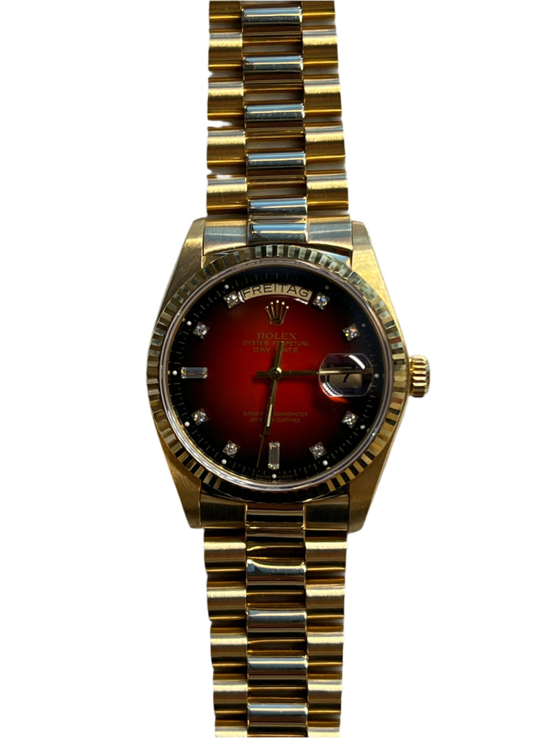 Rolex - Pre-owned Yellow Gold Day-Date 36 Single Quick Set German Date-Wheel Red Vignette Diamond Dial 18038