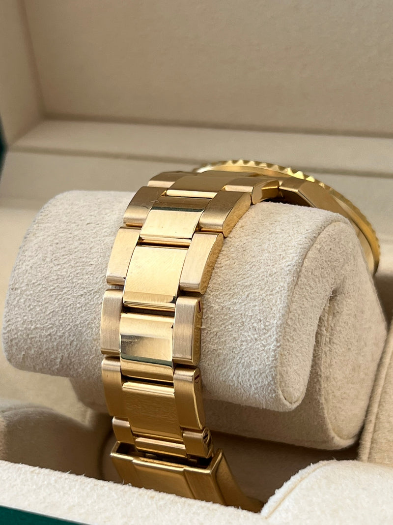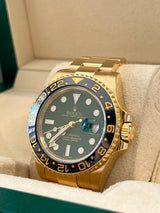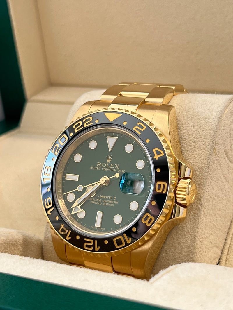 Pre-owned 2016 40mm Yellow Gold 116718LN Rolex GMT-Master II Green Dial with a Black Bezel on an Oyster Bracelet.