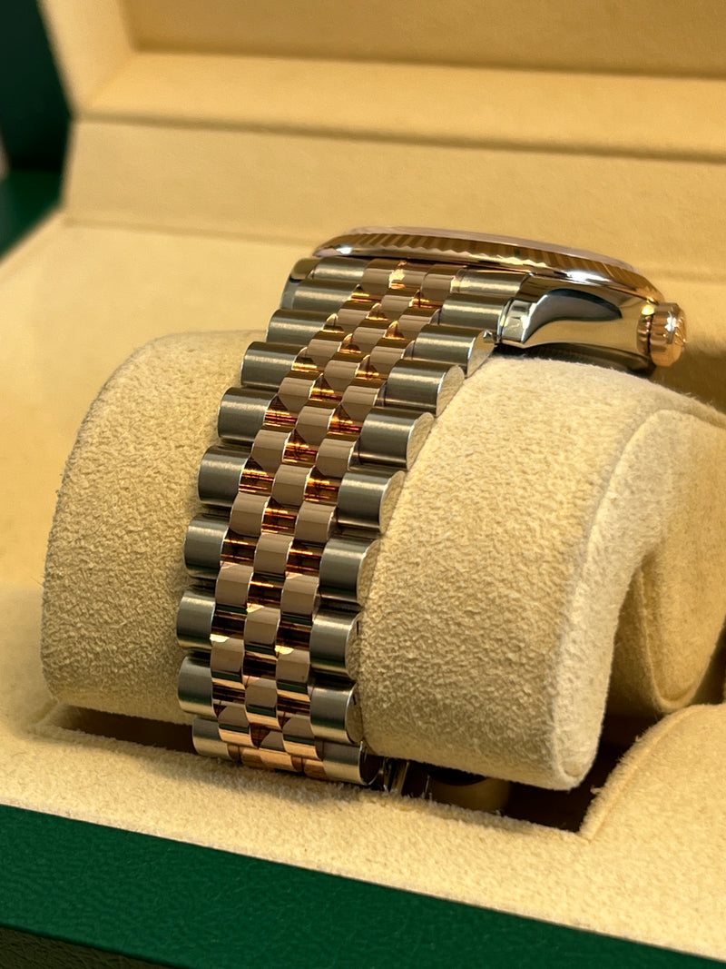 Unworn 2022 36mm two tone rose gold 126231 Rolex Datekist 36 Silver Motif Dial with a Rose Gold Fluted Bezel.