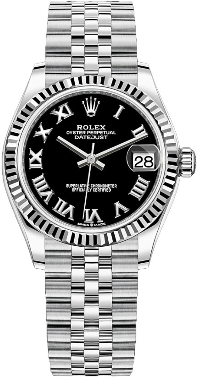 Unworn 2024 31mm Stainless Steel 278274 Rolex Datejust 31 Black Roman Dial with a White Gold Fluted Bezel on a Jubilee Bracelet.