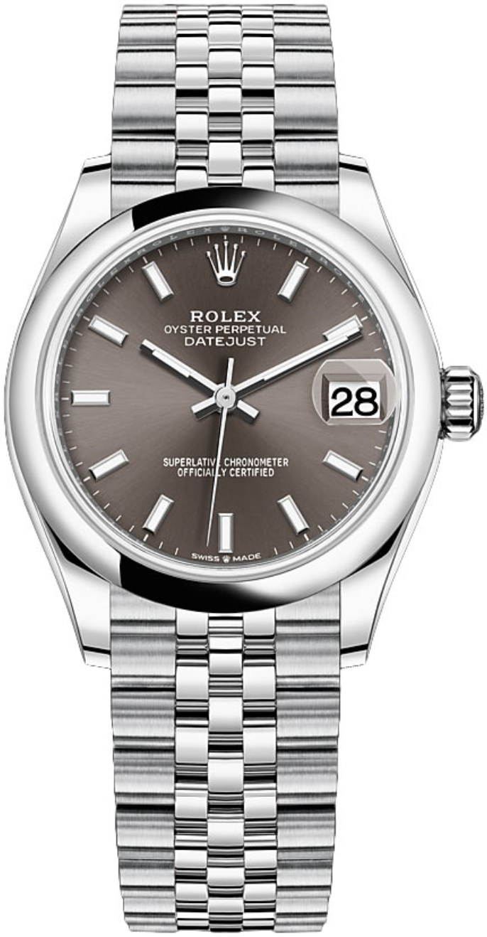 Unworn 2024 31mm Stainless Steel 278240 Rolex Datejust 31 Dark Grey Index Dial with a Stainless Steel Smooth Bezel on a Jubilee Bracelet.