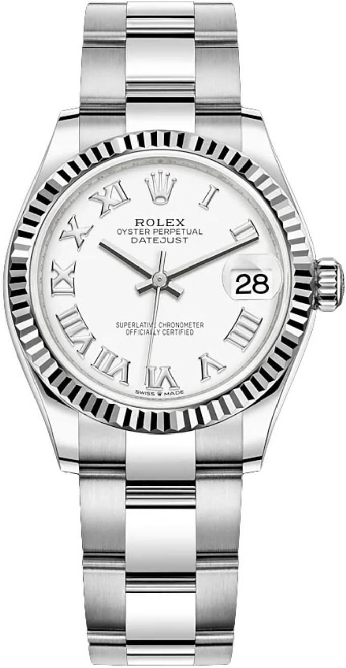 Unworn 2024 31mm Stainless Steel 278274 Rolex Datejust 31 White Roman Dial with a White Gold Fluted Bezel on an Oyster Bracelet.