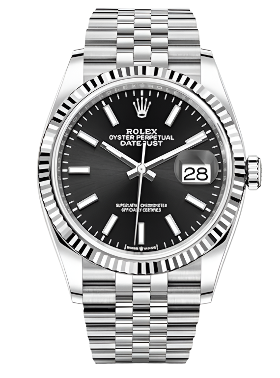 Unworn 2024 36mm Stainless Steel 126234 Rolex Datejust 36 Black Dial with a White Gold Fluted Bezel on a Jubilee Bracelet.