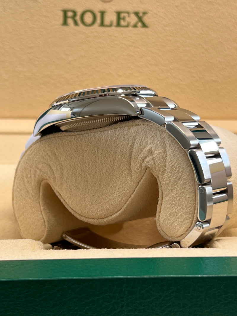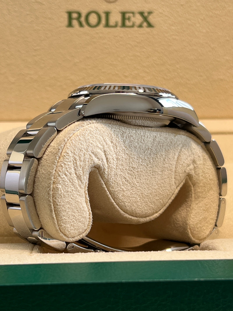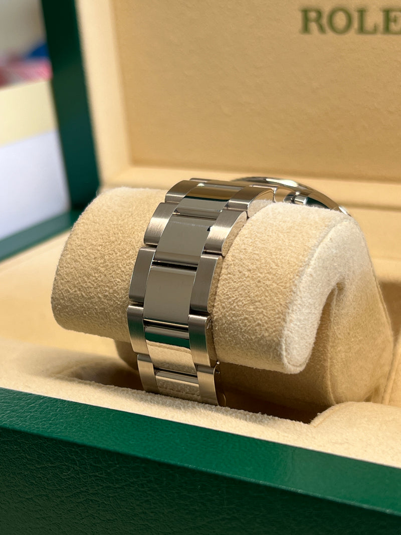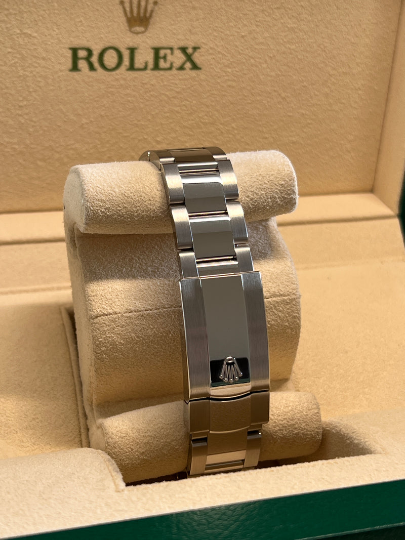 This watch depicts no signs of wear. This watch includes the original Rolex warranty card and the original Rolex box. The watch also includes a 1 year David and Sons Timepiece warranty.