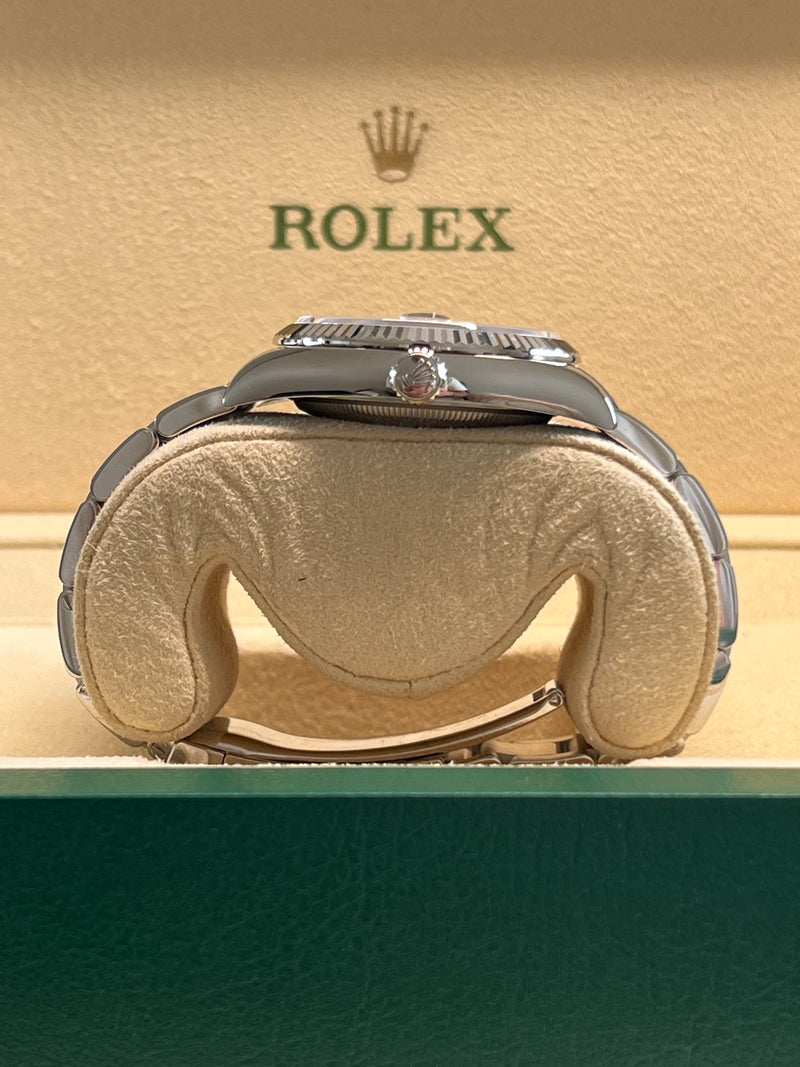 Unworn 2024 36mm Stainless Steel 126234 Rolex Datejust 36 Green Palm Motif Dial with a White Gold fluted Bezel and Oyster Bracelet.