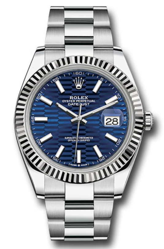 Unworn 2024 41mm Stainless Steel 126334 Rolex Datejust 41 Blue Motif Dial with a White Gold Fluted Bezel on an Oyster Bracelet.