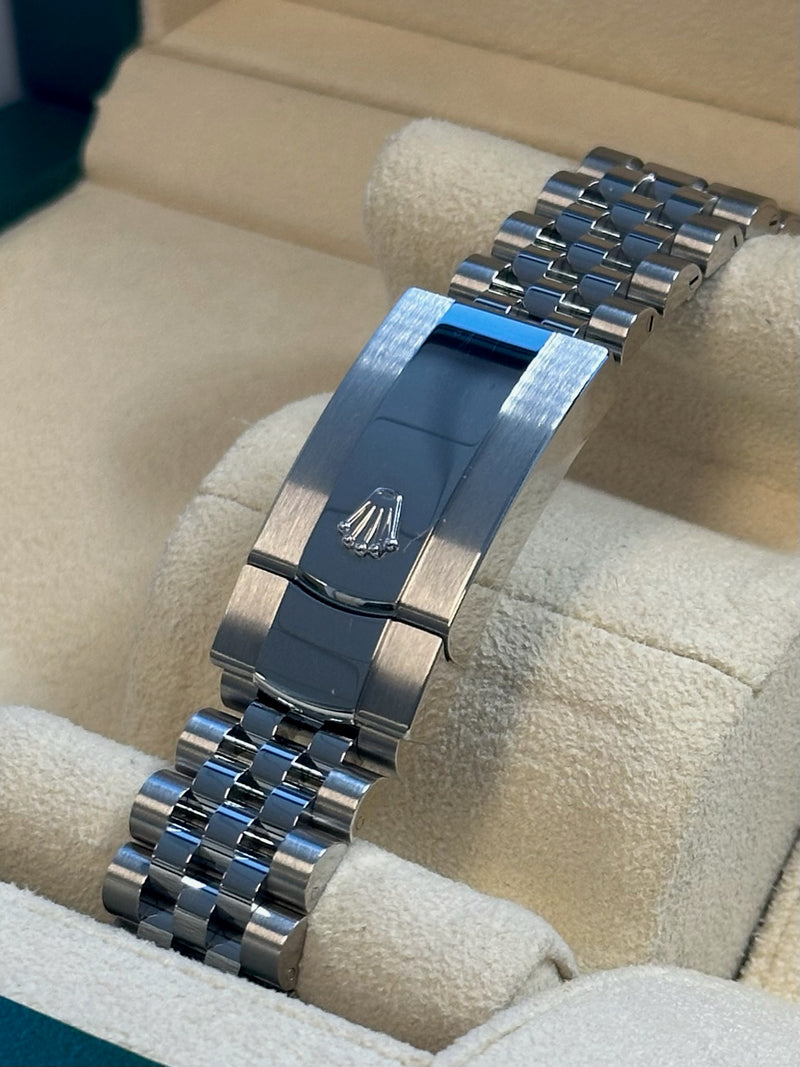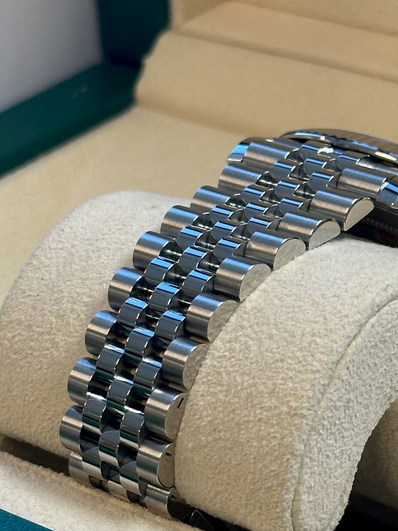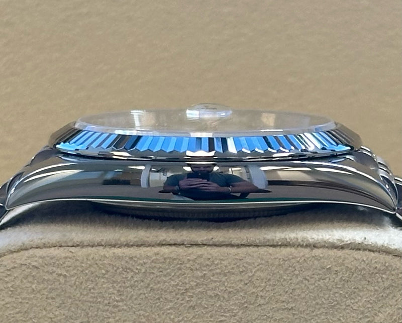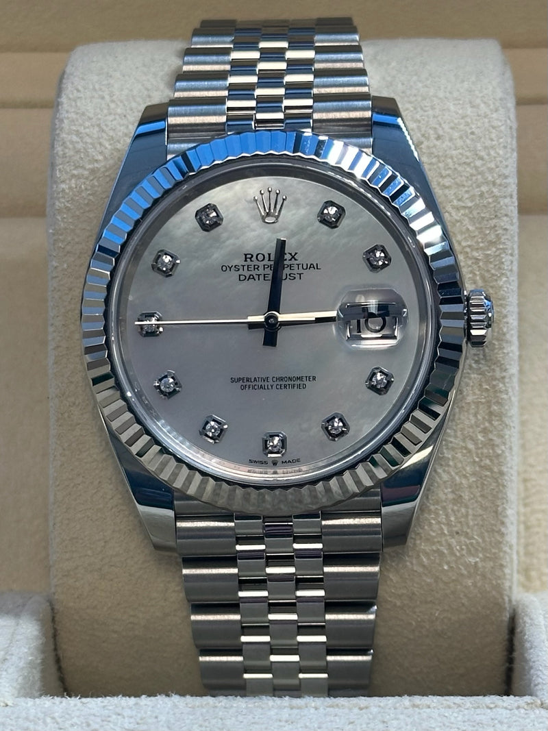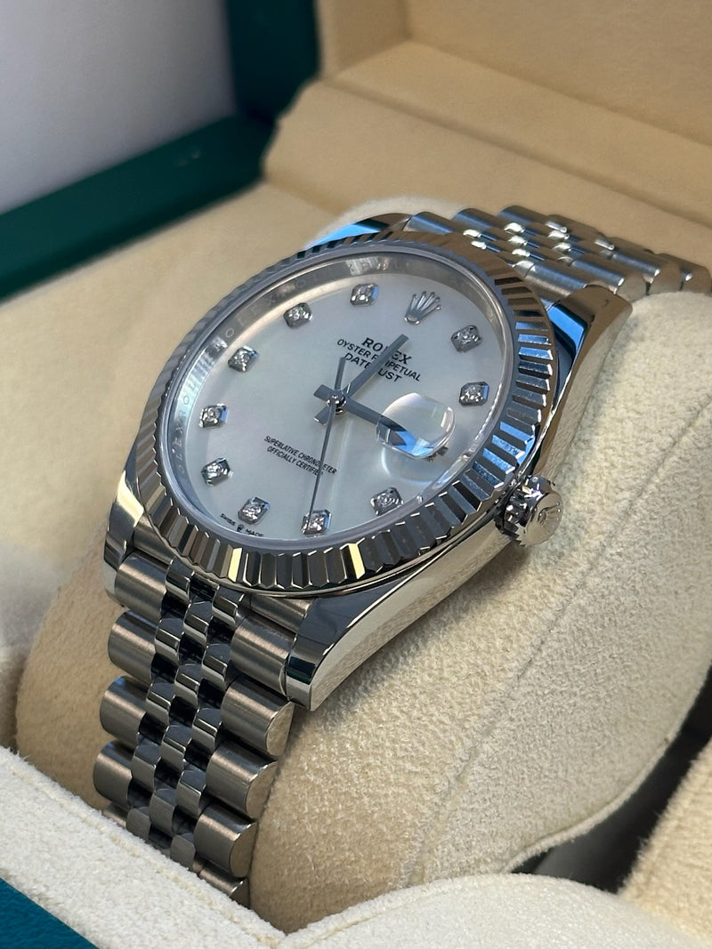 Unworn 2024 28mm Stainless Steel 126334 Rolex Datejust 41 Mother of Pearl (MOP) Diamond Dial with a White Gold Fluted Bezel on a Jubilee Bracelet.