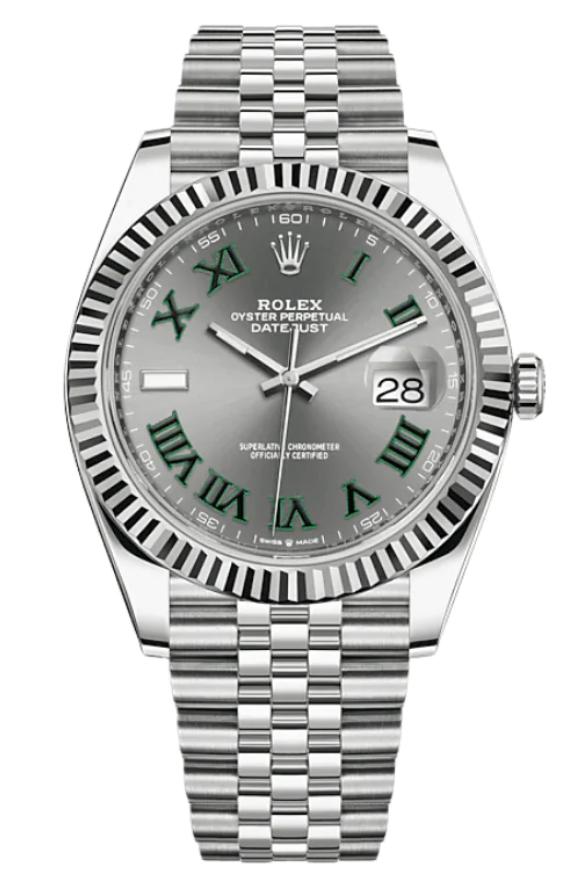 Unworn 2024 41mm Stainless Steel 126334 Rolex Datejust Wimbledon Dial with a White Gold fluted Bezel and Jubilee Bracelet.
