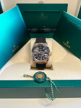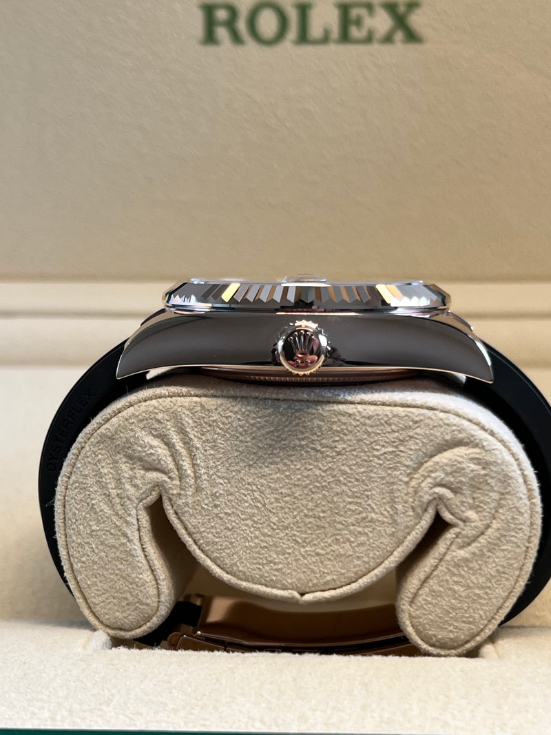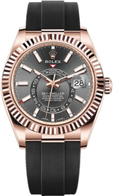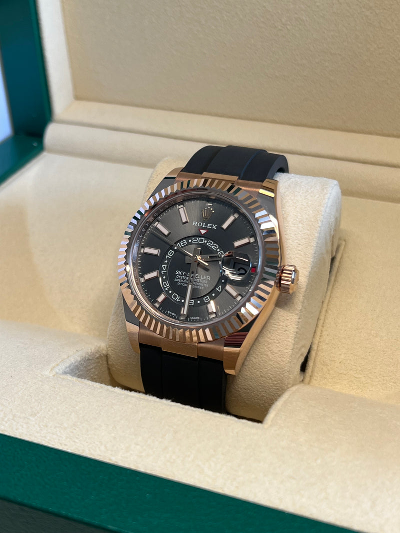 Unworn 2023 42mm Rose Gold 326235 Rolex Sky-Dweller Black Dial with a Rose Gold Fluted Bezel on an Oysterflex Bracelet.