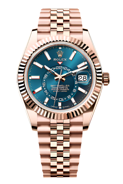 Unworn 2024 42mm Rose Gold 336935 Rolex Sky-Dweller Blue Dial with a Rose Gold Fluted Bezel on a Jubilee Bracelet.