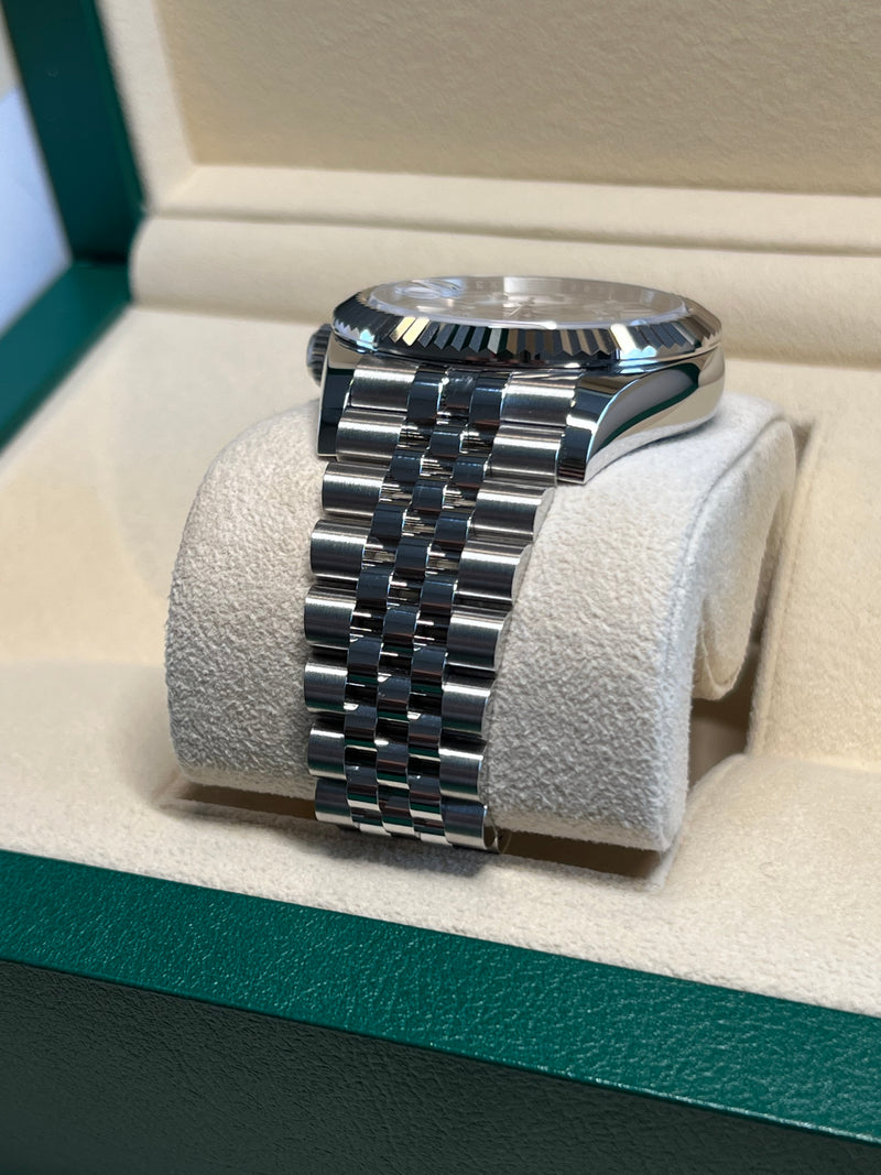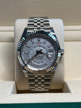 Unworn 2023 42mm White Gold 336934 Rolex Sky-Dweller White Index Dial with a White Gold Fluted Bezel on a Jubilee Bracelet.