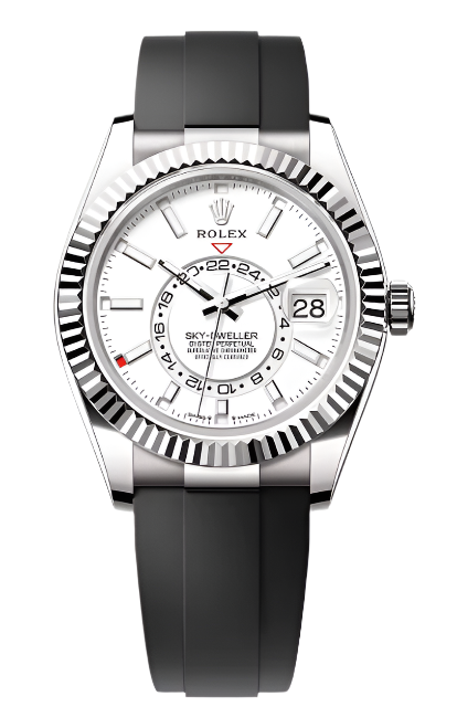 Unworn 2024 42mm White Gold 336239 Rolex Sky-Dweller White Dial with a White Gold Fluted Bezel on an Oysterflex Bracelet.