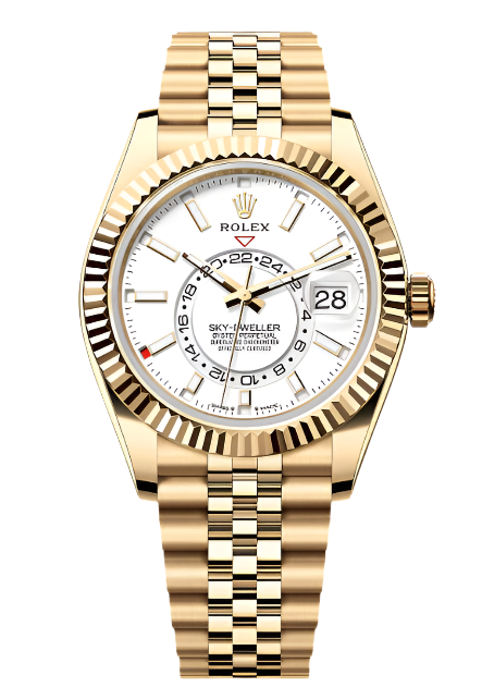 Unworn 2024 42mm Yellow Gold 336938 Rolex Sky-Dweller White Dial with a Yellow Gold Fluted Bezel on a Jubilee Bracelet.