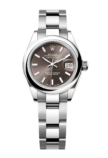 Unworn 2024 28mm Stainless Steel 279160 Rolex Lady-Datejust Dark Grey Index Dial with a Smooth Stainless Steel Bezel on an Oyster Bracelet.