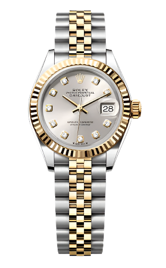 Unworn 2024 28mm Two Tone Yellow Gold 279173 Rolex Lady-Datejust Silver Diamond Dial with a Yellow Gold Fluted Bezel on a Jubilee Bracelet.