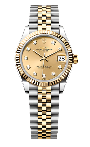 Unworn 2024 31mm Two Tone Yellow Gold 278273 Rolex Datejust 31 Champagne Diamond Dial with a Yellow Gold Fluted Bezel on a Jubilee Bracelet.