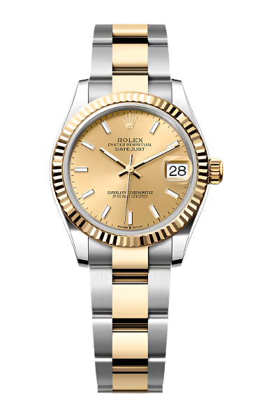 Unworn 2024 31mm Two Tone Yellow Gold 278273 Rolex Datejust 31 Champagne Index Dial with a Yellow Gold Fluted Bezel on an Oyster Bracelet.