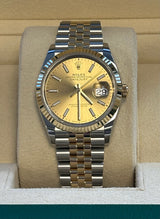 Unworn 2024 36mm Two Tone Yellow Gold 126233 Rolex Datejust 36 Champagne Index Dial with a Fluted Yellow Gold Bezel on a Jubilee Bracelet.