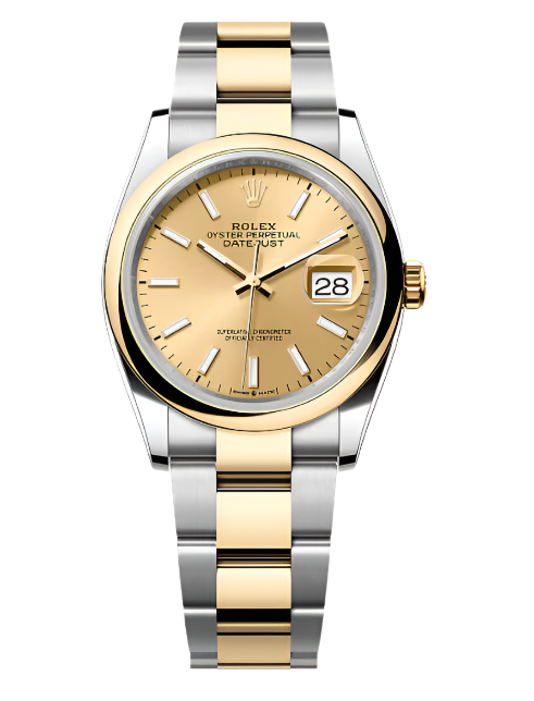 Unworn 2024 36mm Two Tone Yellow Gold 126203 Rolex Datejust 36 Champagne Index Dial with a Yellow Gold Smooth Bezel on an Oyster Bracelet.