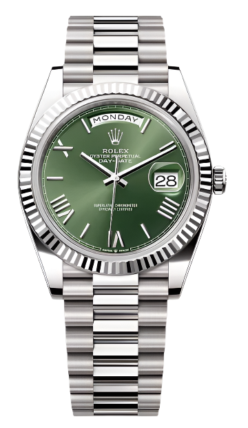 Unworn 2024 40mm White Gold 228239 Rolex Day-Date 40 "Presidential" Olive Green Roman Dial with a Fluted White Gold Bezel on a Presidential Bracelet.
