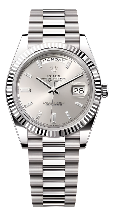 Unworn 2024 40mm White Gold 228239 Rolex Day-Date 40 "Presidential" Silver Baguette Dial with a Fluted White Gold Bezel on a Presidential Bracelet.