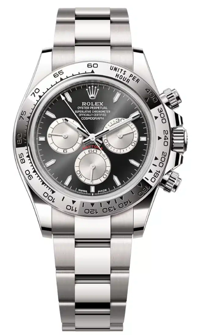 Unworn 2024 40mm White Gold 126509 Rolex Daytona Black Dial with a White Gold Bezel on an Oyster Bracelet.