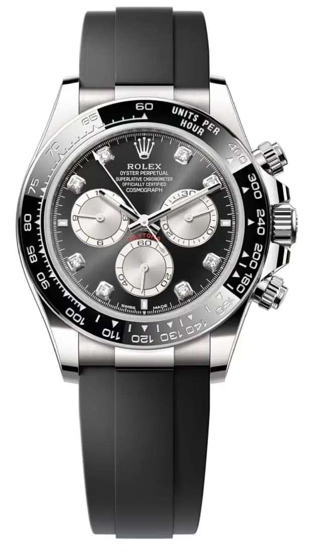 Unworn 2024 40mm White Gold 126519LN Rolex Daytona Black Diamond Dial with a Black Bezel on an Oysterflex Bracelet.
