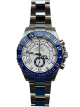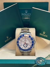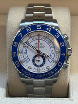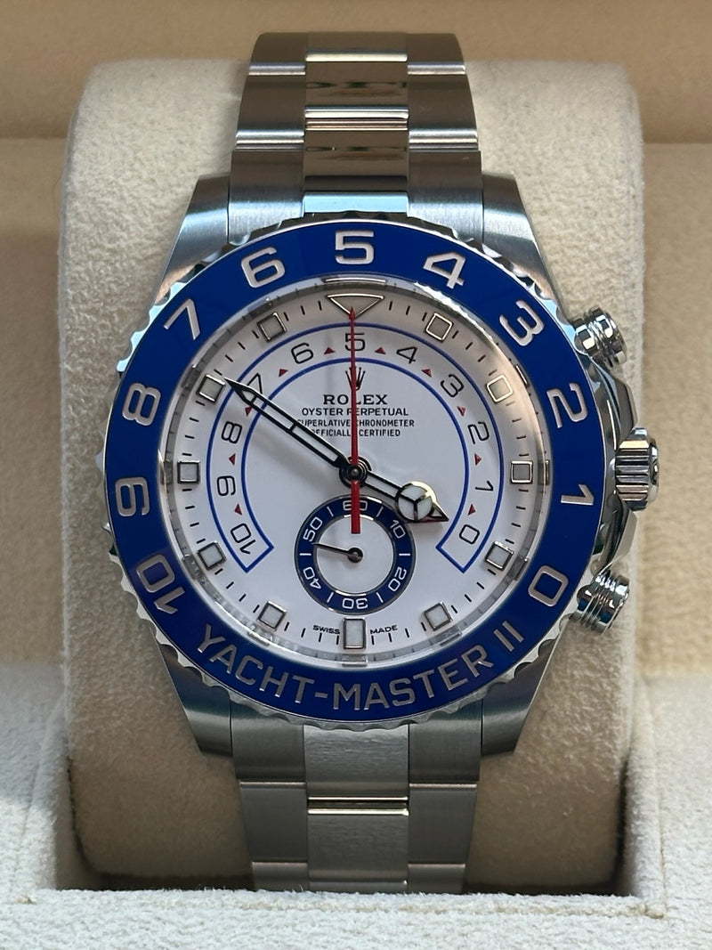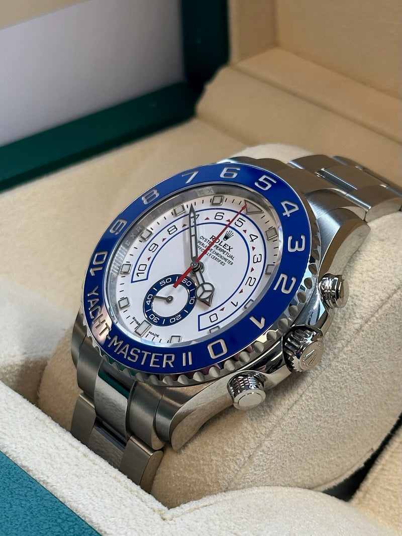 Unworn 44mm Stainless Steel 116680 Rolex Yacht-Master II White Dial with a Blue Bezel on an Oyster Bracelet.