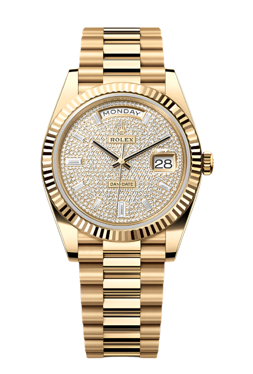 Unworn 2024 40mm Yellow Gold 228238 Rolex Day-Date "Presidential" Pave Diamond Dial with a Fluted Yellow Gold Bezel on a Presidential Bracelet.