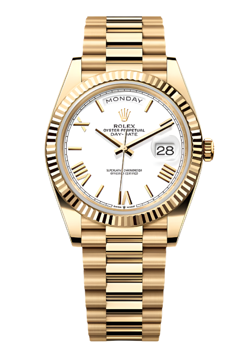 Unworn 2024 40mm Yellow Gold 228238 Rolex Day-Date "Presidential" White Roman Dial with a Fluted Yellow Gold Bezel on a Presidential Bracelet.