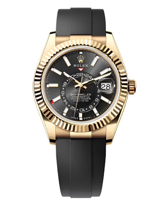 Unworn 2024 42mm Yellow Gold 336238 Rolex Sky-Dweller Black Dial with a Yellow Gold Fluted Bezel on an Oysterflex Bracelet.